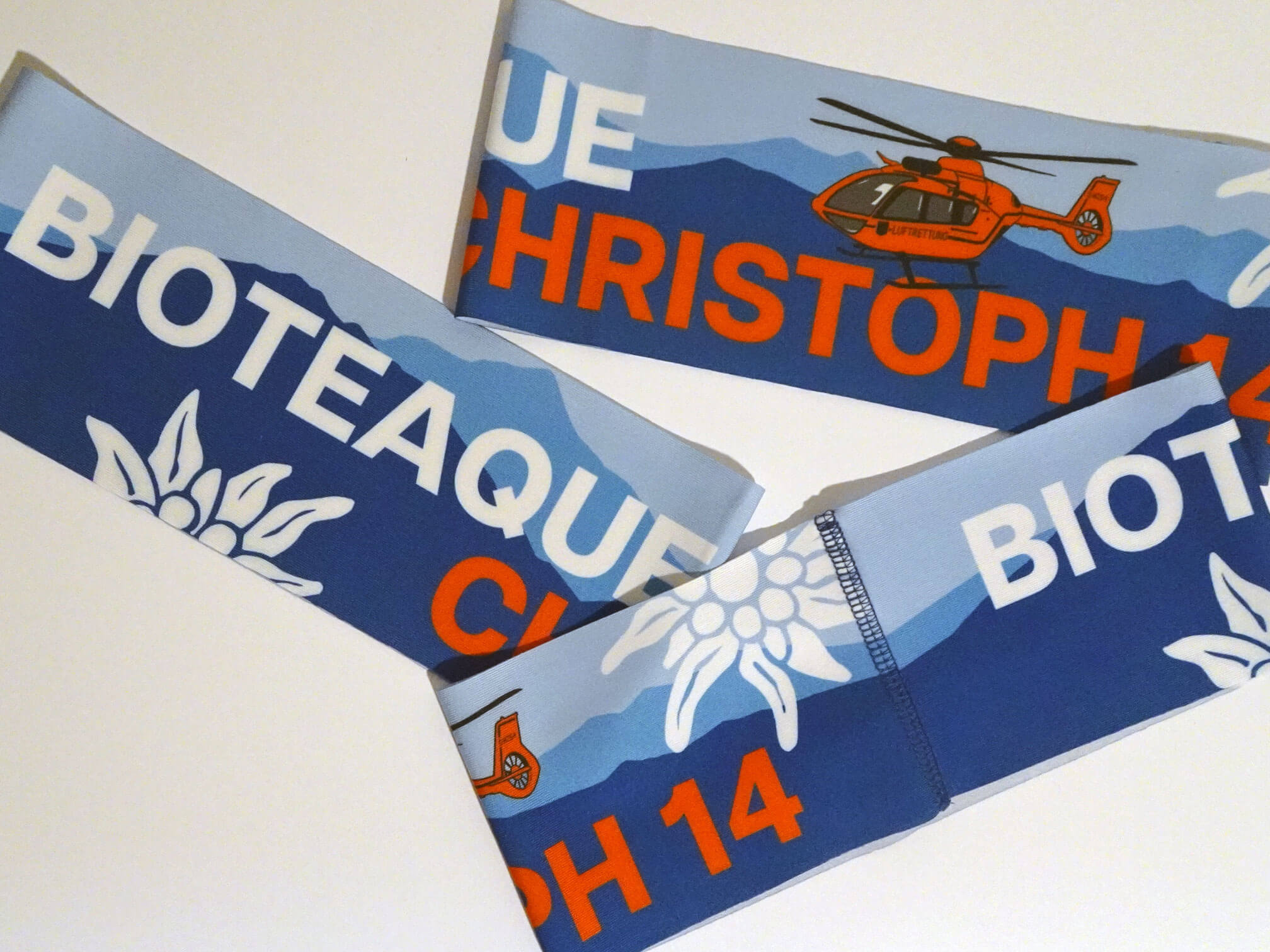 Leicht, atmungsaktiv und schnelltrocknend: Stirnband Christoph 14 mit Hubschrauber-Motiv und Schriftzügen.